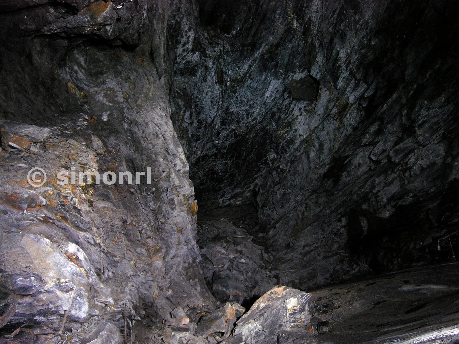 From D floor, back vein chamber 8E looking down to E floor. The way down was to slide :) The level just about visible is part of the Cwmorthin round trip, two chambers before reaching Lefel Ffrench.