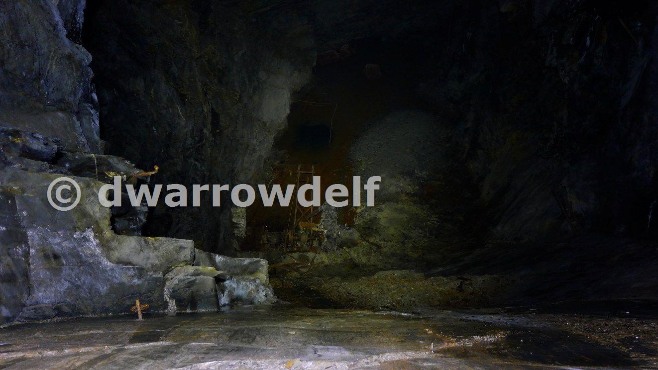 At the base of the manway on floor C it was possible to look down to floor E and the crane-like winder at the head of the flooded E-G incline, which can be seen as the dark square above the winder structure in the photo. This short incline was driven by Oakeley to extract slate below Cwmorthin's own workings.