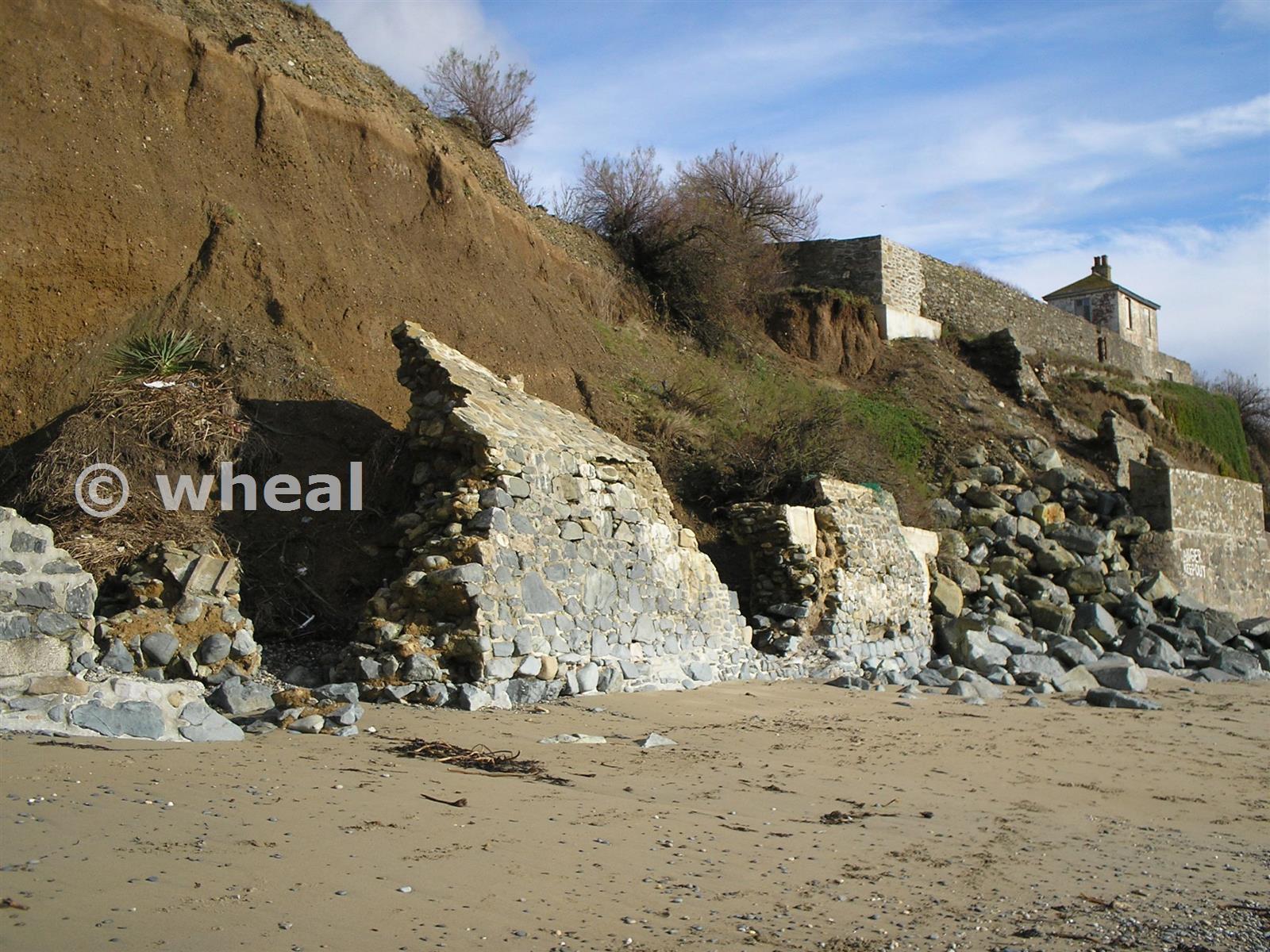 Looking east with the low building and 'engine house type' structure on the cliff edge. The last building stands on the very edge of the grounds of Chymorvah House which is now a hotel.