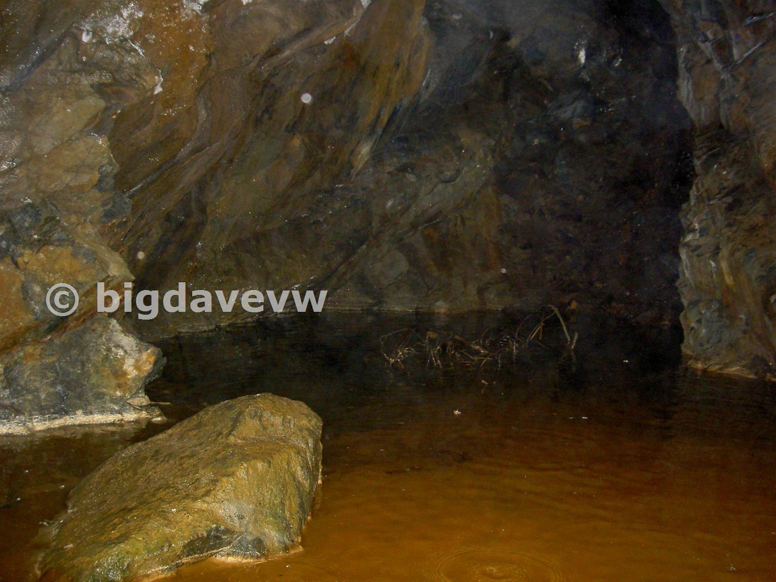 Looking further to the left from the entrance. The area above is stoped, with a wooden support. Just behind the branch is a flooded lower level