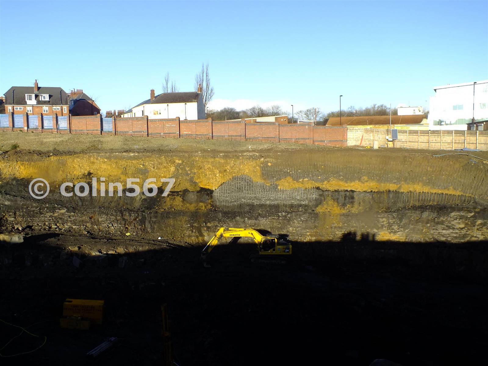 Above and to the left,(W), of the excavator, the sandstone above the High Main seam is frost shattered. In it is the shadow of a possible bell pit. To the right, (E), glacial action has removed the sandstone and coal, leaving boulder clay in its place.