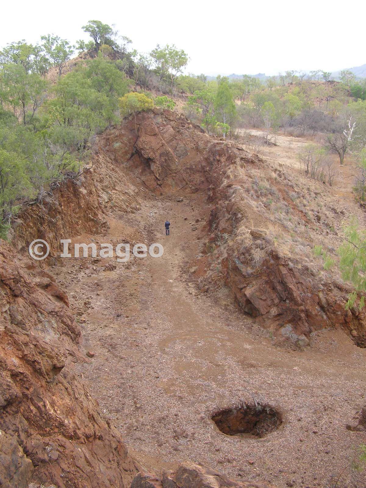 Anotehr view along the axis of the open-cut, this time from the southeast. One of the exploratory shafts in the floor of the pit is also seen.