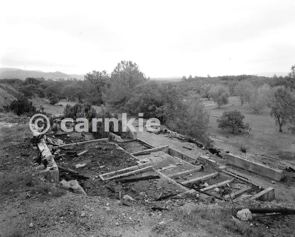 VIEW OF LOWER MILL FLOOR FOUNDATION, SHOWING, LEFT TO RIGHT, EDGE OF MILLING FLOOR, TABLE FLOOR, VANNING FLOOR, LOADING LEVEL, TAILINGS POND IN RIGHT BACKGROUND. VIEW IS LOOKING FROM THE NORTHWEST Courtesy Library of Congress, Prints & Photographs Division, HAER, Reproduction number HAER CAL,5-COP.V,3-2