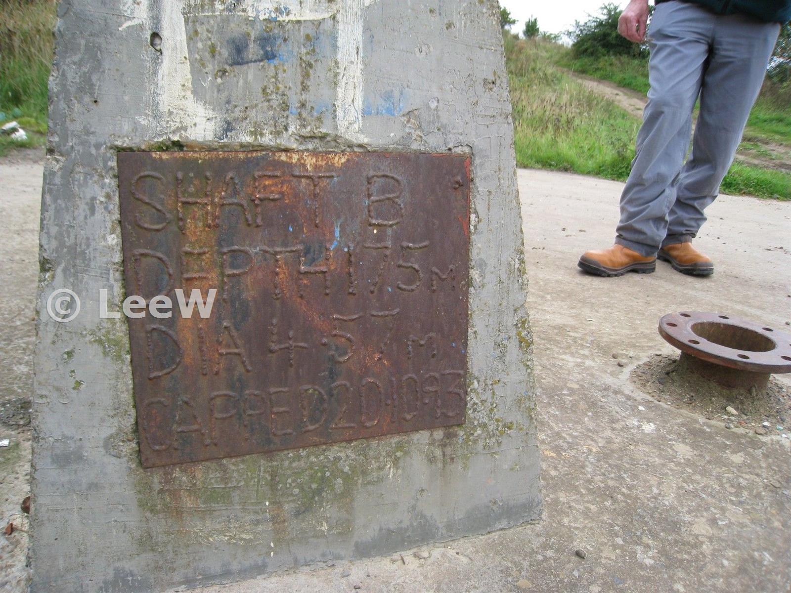 Insciption on plaque reads: 'Shaft B; Depth 175m; Dia 4.56m; Capped 20.10.93'