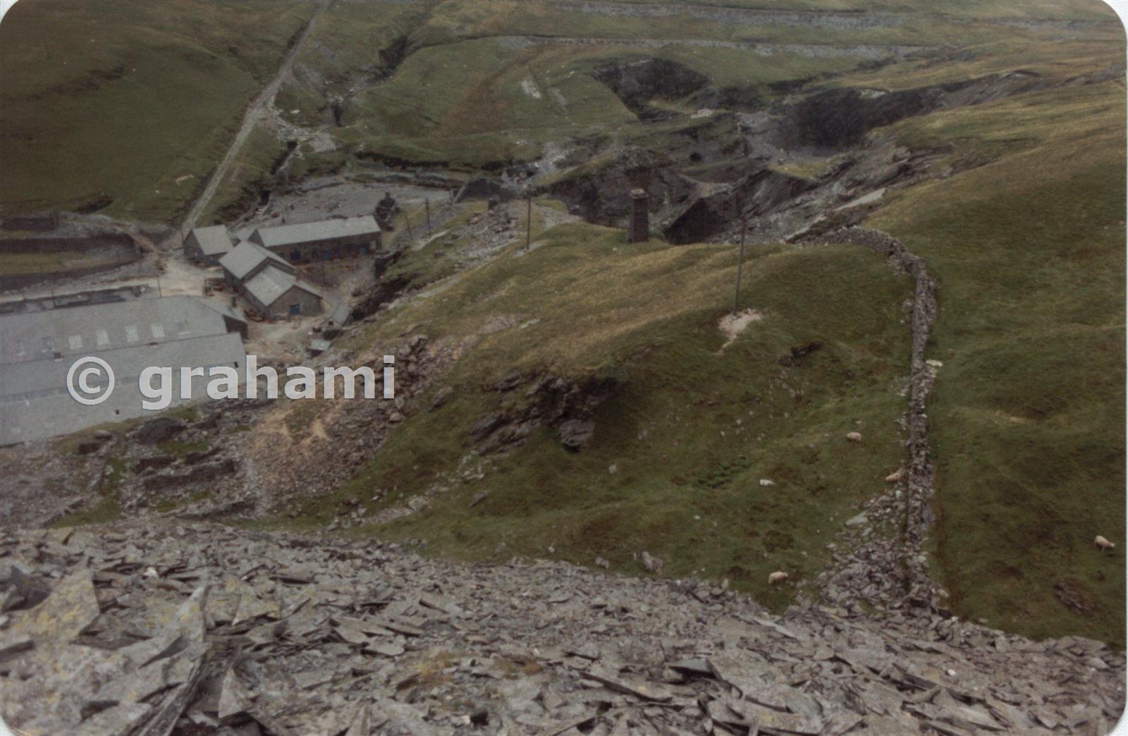 Viewed from a Diffwys tip looking North. In the distance is the David Jones' Quarry with the tunneller level visible just to the right of the chimney.