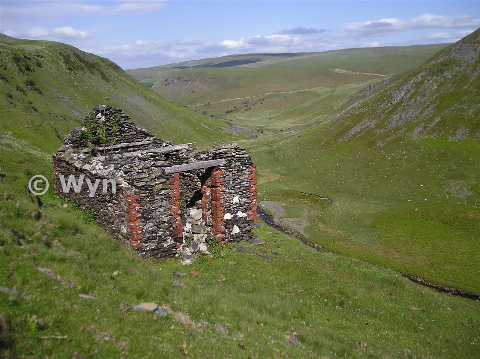 A view of the magazine, looking east down the valley to the Nant y Car South and Dalrhiw Mines. Taken on the 13th of June 2005.