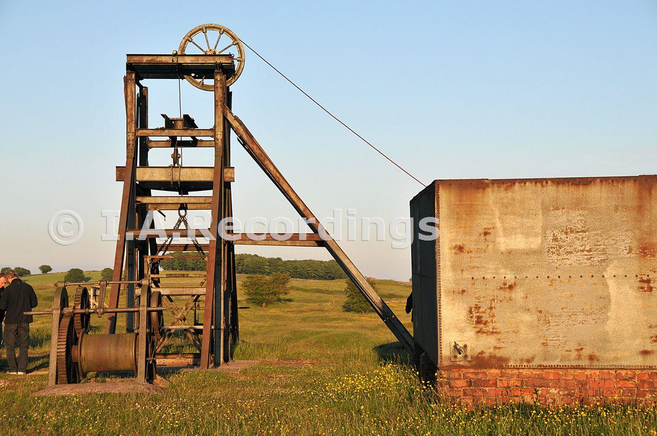 Steel headframe over the shaft at Magpie, with hand windlass in left foreground and metal tank on the right.