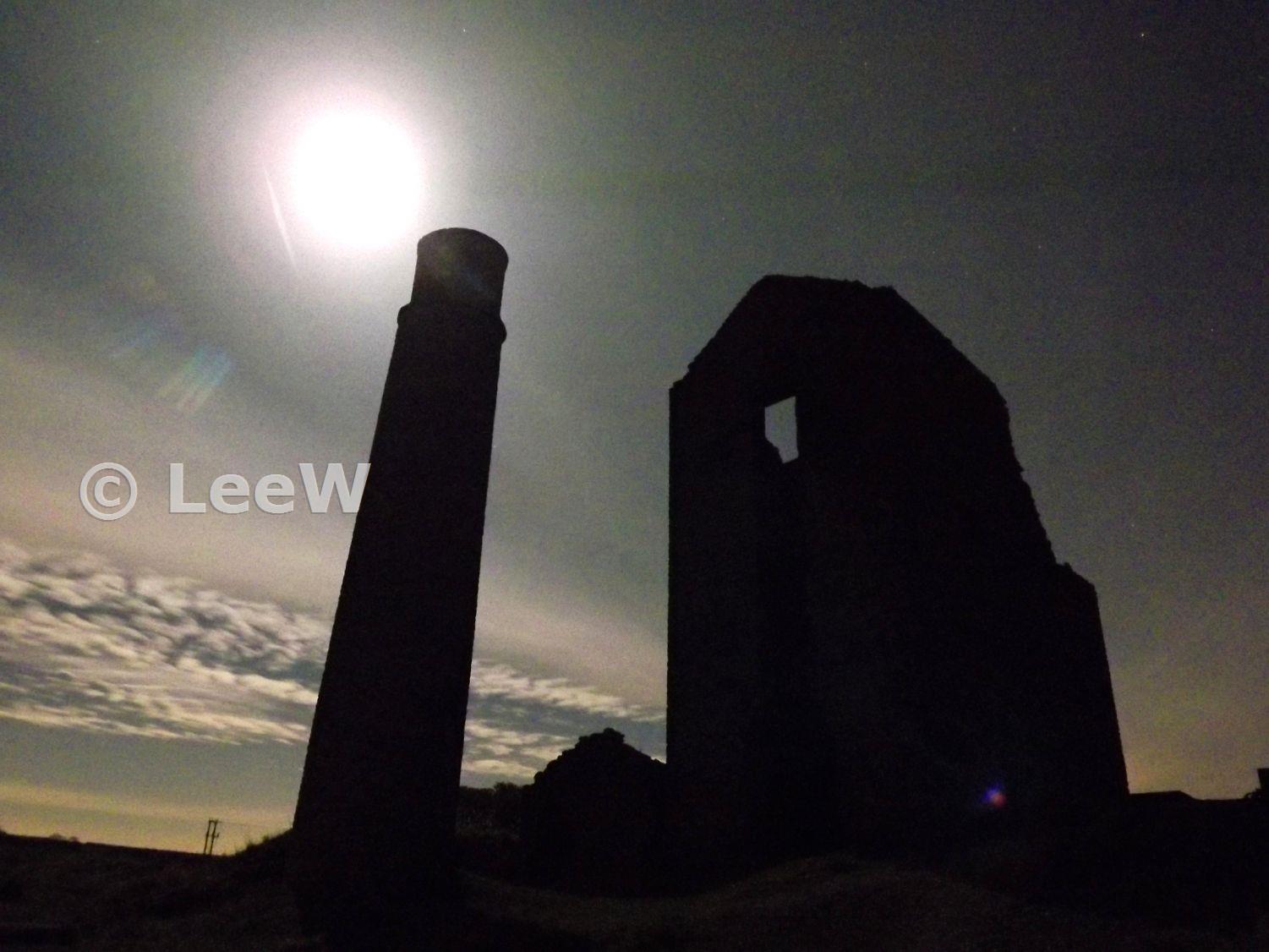 View of the moon casting shadows of the engine house & chimney. Part of a round of experimental photos taken with my simple Fuji - only has a max of 8sec exposure, hence a lower ISO (800) makes the photo darker. Apeture set to f3.1 with a focal length of 4.3mm. Unfortunately the wind was a bit gusty and was blowing the camera and tripod a little and my camera has no manual focus or ability to lock the focus, this focusing was a little difficult. Hope to re-try this shot when I upgrade my camera.