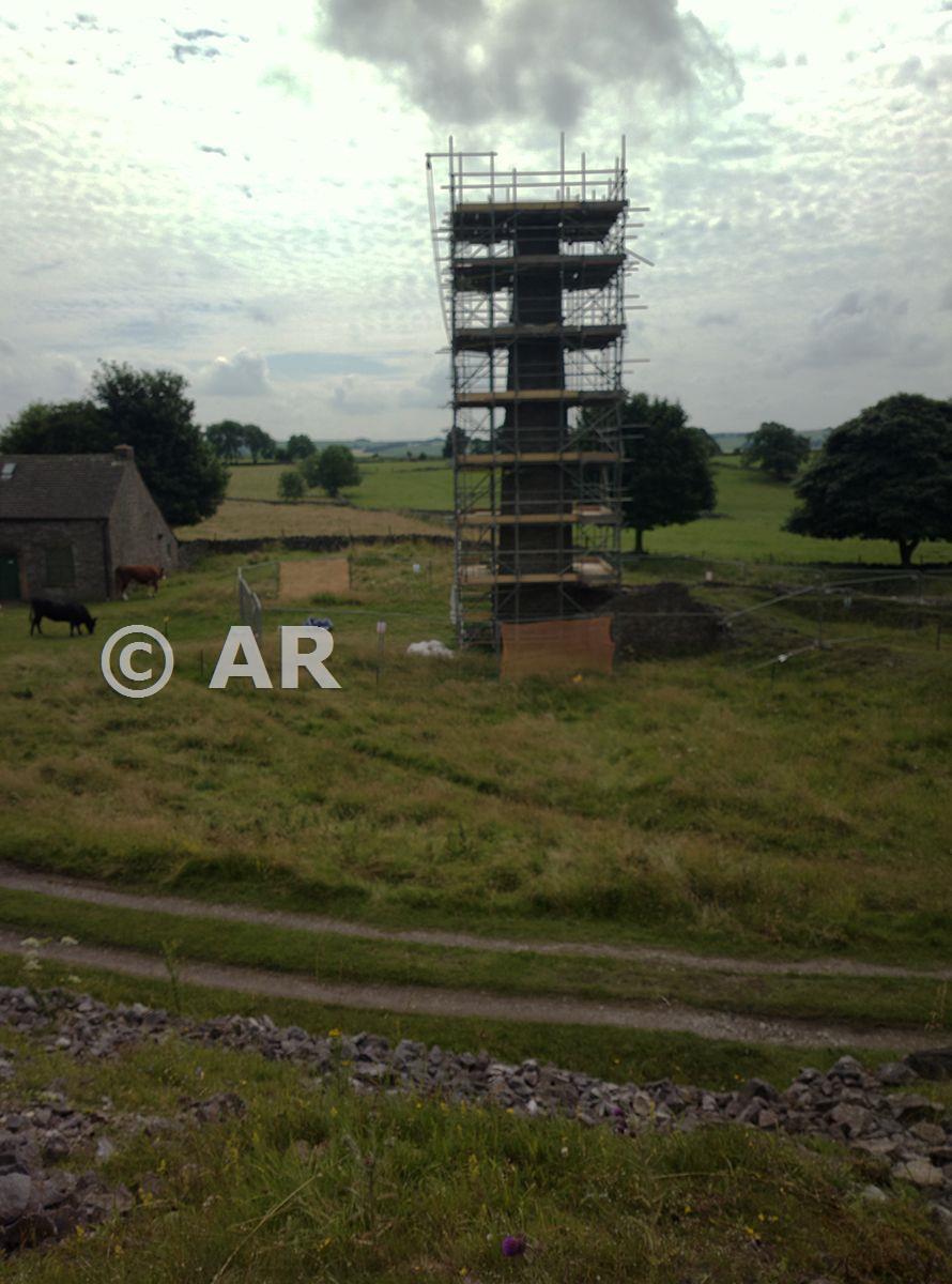 Scaffolding around the square chimney for the HLF-funded restoration work, July 2016. Surveys had identified that part of the inner skin had collapsed and work was urgently needed in order to prevent a more serious structural failure. Having successfully bid for lottery funding, PDMHS contracted a local firm of specialist masons to carry out the work.