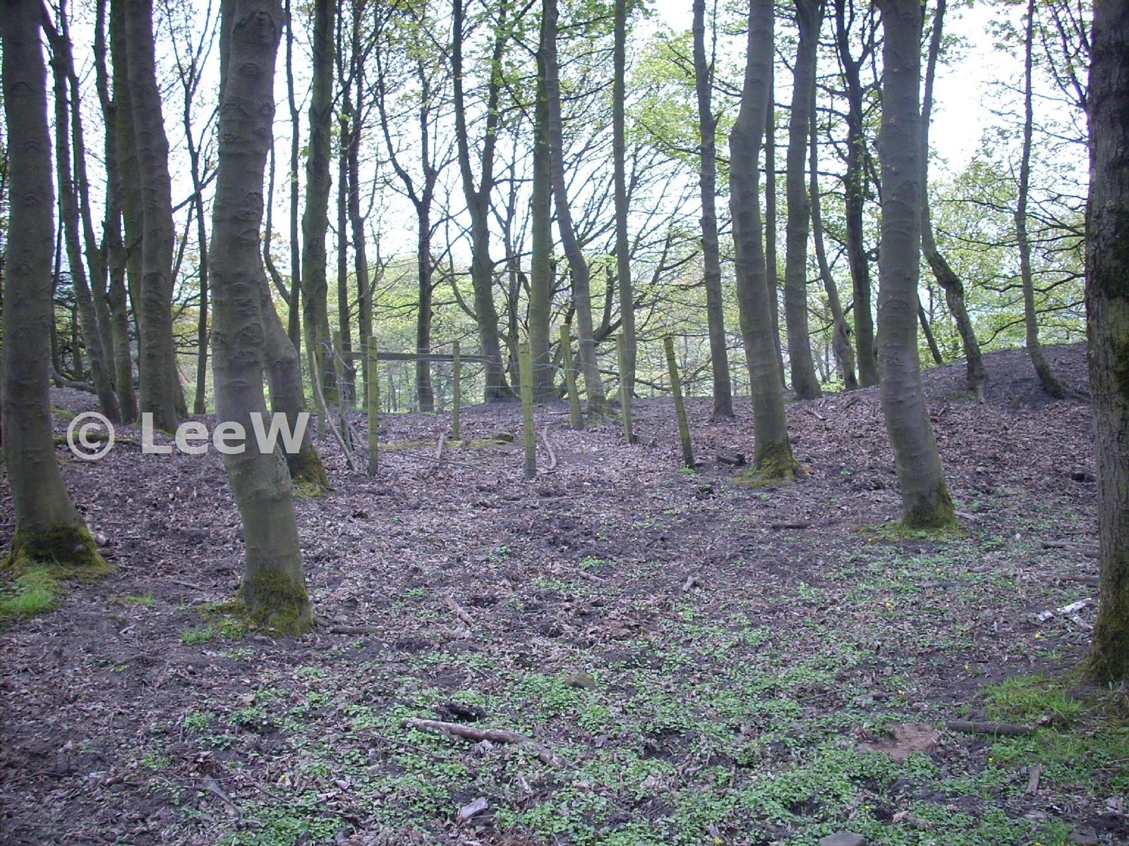 Main engine shaft (fenced and sleepered) and possible gin circle (to hillock on right) (24 April 2009)