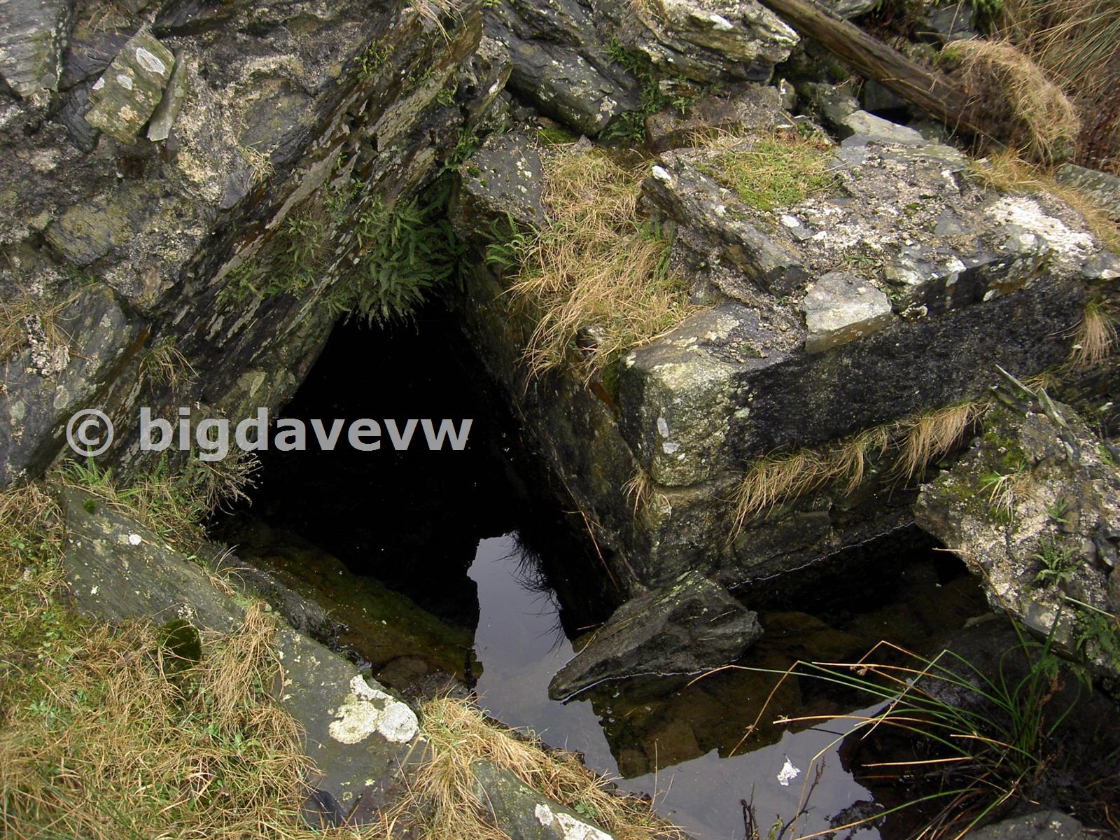 Main shaft just beside the engine house. Part of the engine house wall fell down near the shaft. The shaft is flooded to the top, but looks pretty deep