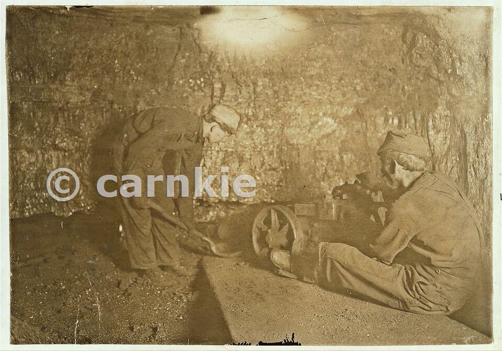 Man with punching machine to drill into coal. Boy shovels out 10 hrs. daily.