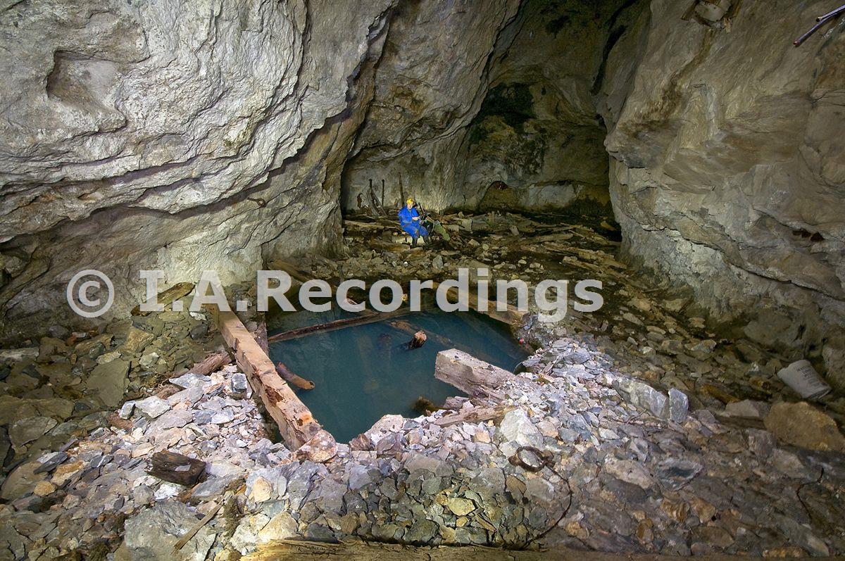 View East along the South East & West Stope across the Man Engine shaft. Figure is sitting on the concrete foundations of the 1950s winder, Main Adit. [October 2012]
