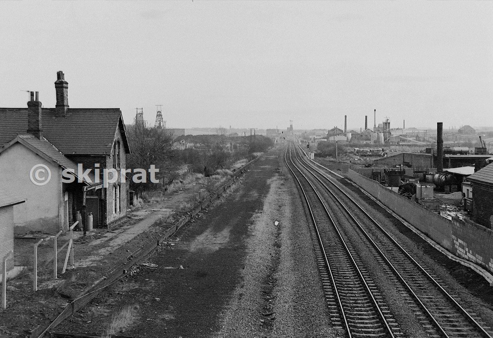 View from the railway bridge at Wath Central station (long closed). No.1 pit headgear directly over the railway lines which have been reduced from four to two. No.2 pit headgear to the left of the railway. This is after the closure of the coke ovens which previously filled the space between the two sets of headgear.