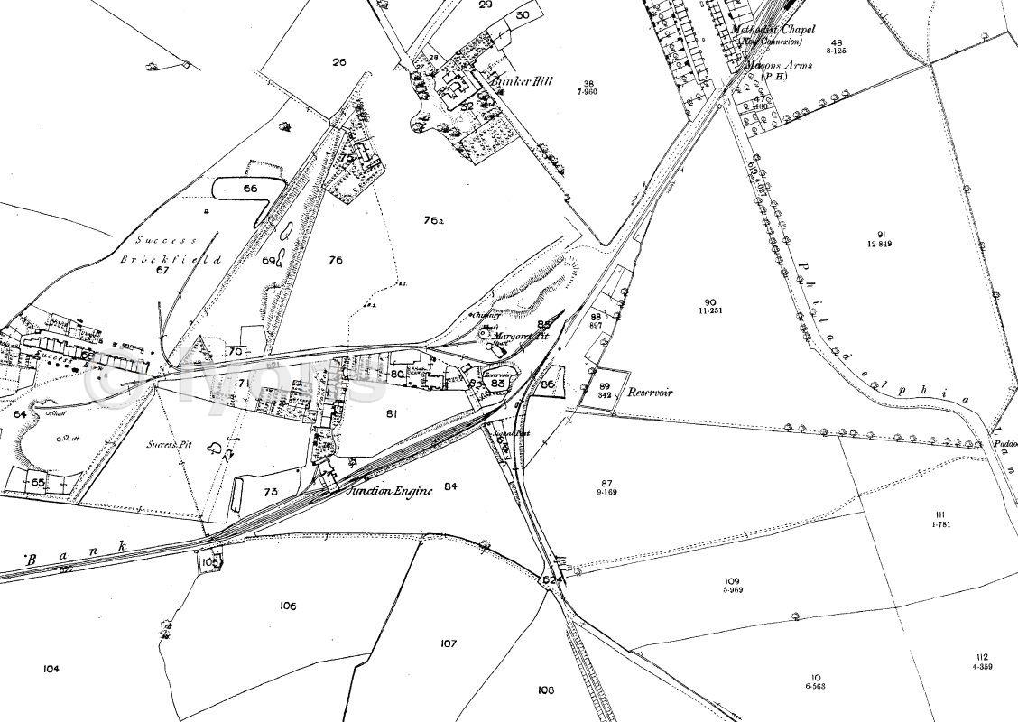 Showing the Success Pit to the top Left, note how the main railway linking both mines ran through the street and the triangle part in the centre formed by the different directions of wagon way is marked Reservoir, This prominent and built up area still remains and is a reminder of its past. Both mines had two shafts. also the large haulage engine to pull the heavy trucks up from the Lambton Pits, It is possible that Stationary engines were dotted along the Wagon way to Sunderland before Steam engines came into play ! The line leading off to the bottom was to the Houghton colliery.