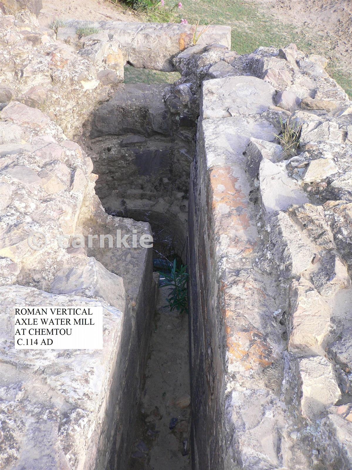 Vertical axle watermill at Chemtou, Tunisia c.114 AD. The date is taken from the inscription CIL VIII, 10117. While the inscription was not attached to this structure, it is reasonably sure that the two are related.