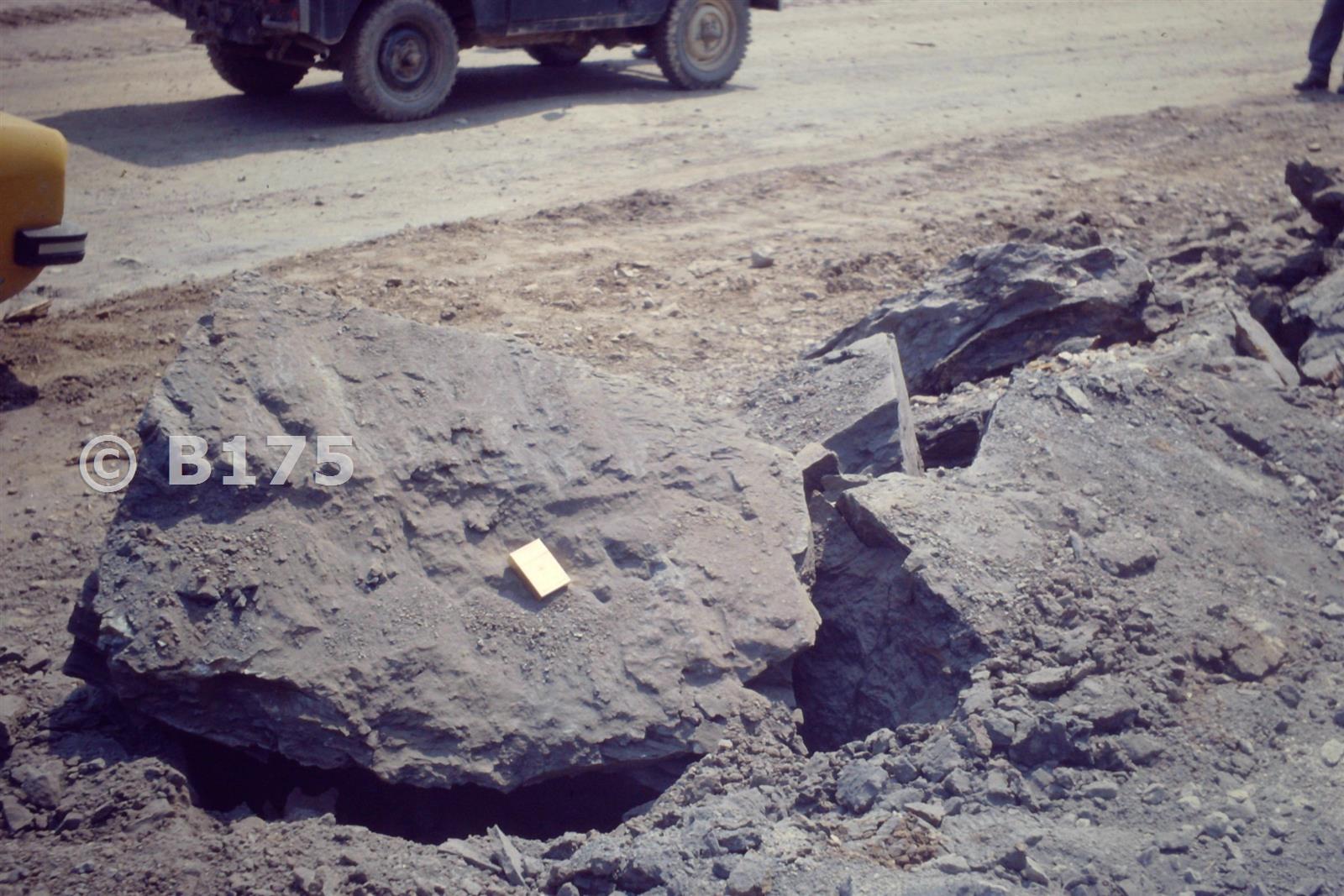 after the explosives - the results! Standard method of measurement - a packet of B and H gives the scale of the drainage trench - meant to be 900mm deep and 450 wide.