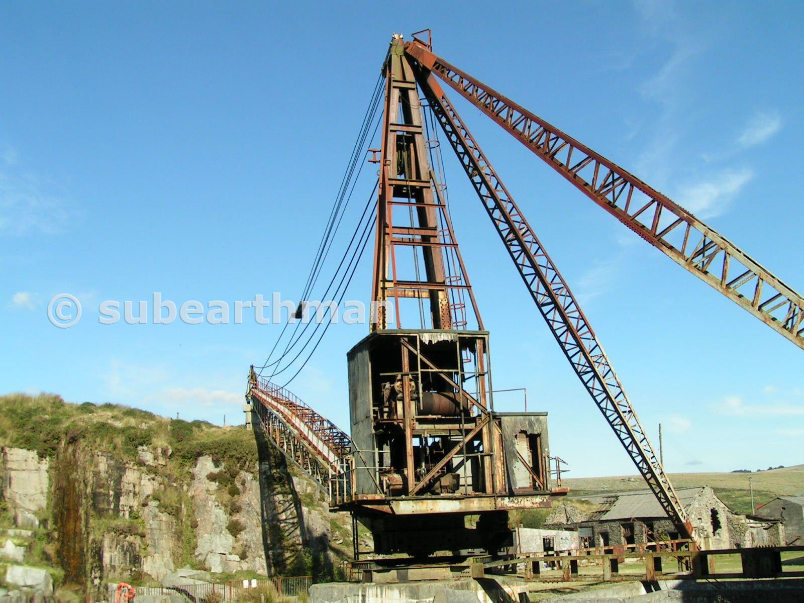 This huge 35 ton Derrick Crane, built by Butters Cranes Ltd. of Glasgow in 1972, was used to shift the quarried stone until work ceased in 1997. After rotting away for 10 years it has now been removed, along with all the cutting machinery in the decaying sheds. A deep flooded pit and huge spoil tip dominate the landscape here now.