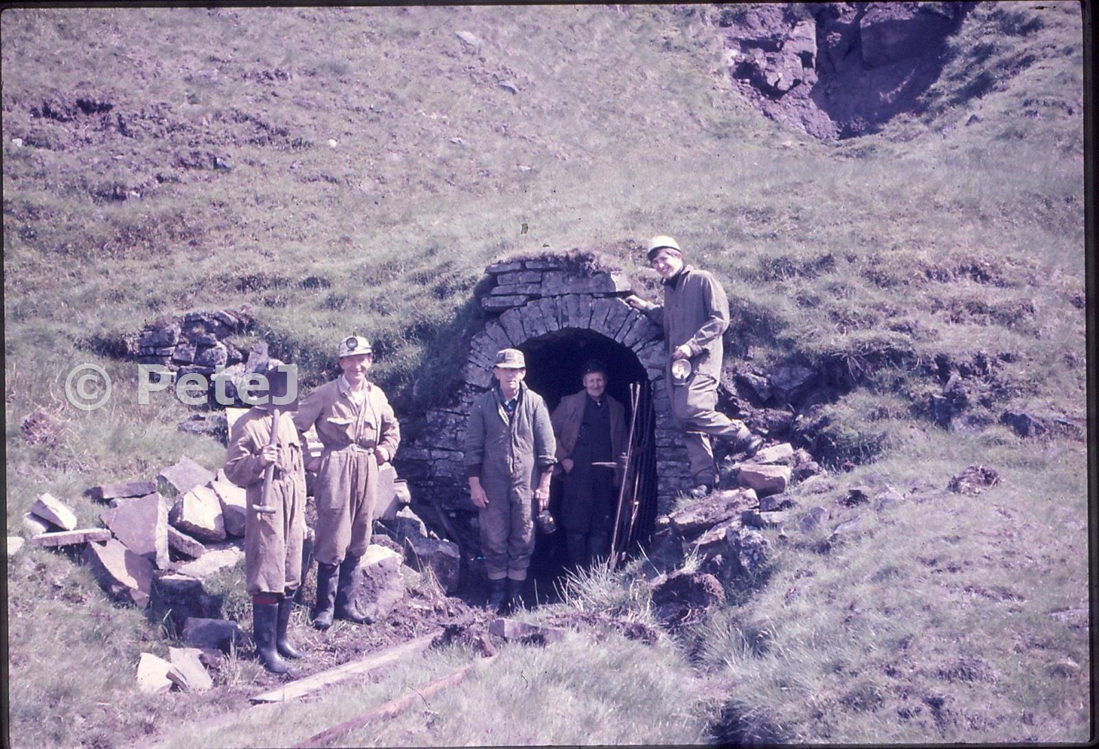 This view was taken on 19 June 1966.Eric Richardson had arranged the removal of a roof fall just inside the level entrance and this was the first visit to the mine. Not far from the entrance was a wagon chassis and a rope noose. Exploration got to the first junction where another roof fall held up progress.
