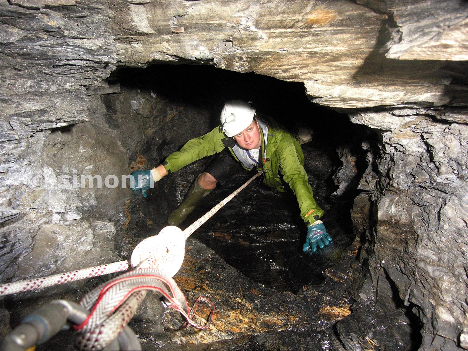 Miles ascending the manway from a lower level, found to be flooded due to collapsed lower adits.