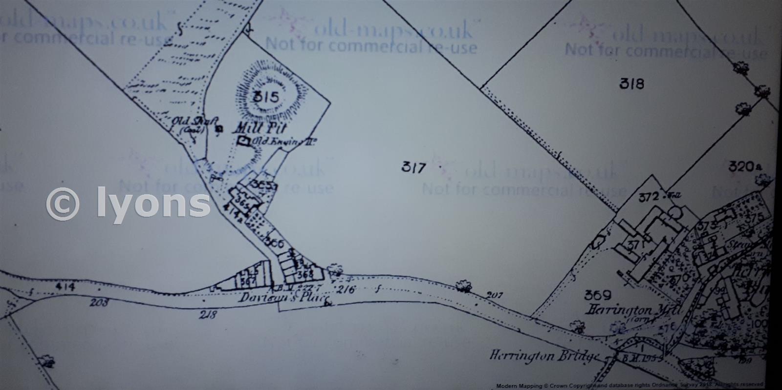 Sometimes listed as Herrington Mill Pit, Herrington Mill was located bottom right. There is very little information on the Durham Miners website http://www.dmm.org.uk/colliery/m035.htm especially owners? whether the mine was owned by the nearby Mill is at present unknown, There was also another Mill nearby on the main road to Penshaw Monument. Like most mines this one had a terrible Disaster. In 1812, 19 Boys and 4 Men were killed in an explosion, with many other severely injured. The nearby St Oswalds Church which this map predates has a memorial to The Lives lost at this mine. No dates are given for the opening or closure, But is possible it had already closed by 1860?As old Engine is shown. It looks to be a primitive mine which shows no links to any wagonways. The 1st building below the mine "building 365" still shows up on later maps although much disfigured and altered, are today part of workshops.