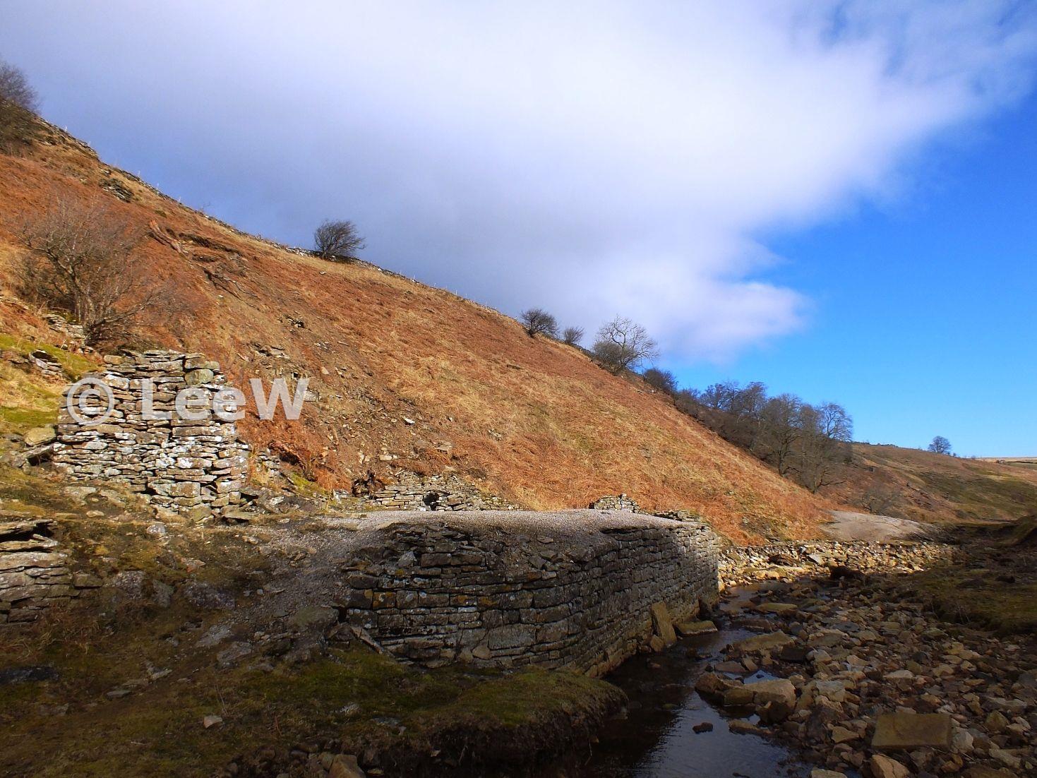 View looking downstream with the mill (crushing?) site on the left and the tips beyond