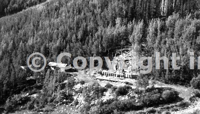 Gold Queen mill and cabins, Gold Queen Mine. Gold Queen Gulch, Abajo Mountains. San Juan County, Utah. 1915