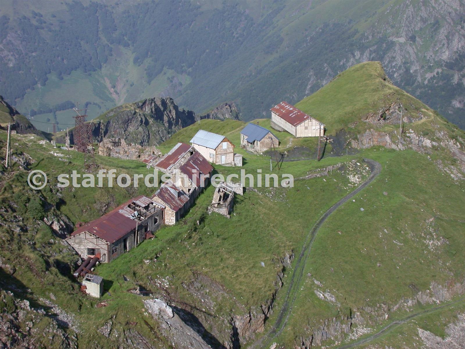 Not an aeriel photo! Taken from Station Narbonne. Gives an idea of vertical distances involved in this mine surface layout. Cableway leads off to the left and crosses rock ridge towards mill. Zig-zag track approaches the mine from right after dozens of hairpin bends.