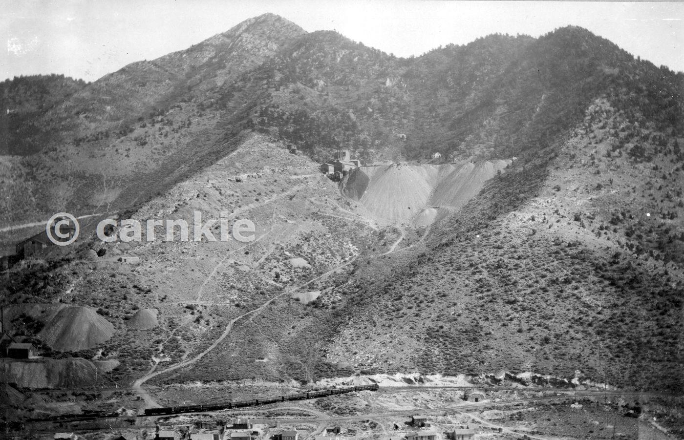 Centennial Eureka mine dump from south summit of Keystone Ridge, shows dismantled mill and the dumps of the Eureka Hill mine on left; Eureka Hill open cut, where ore was first found, between Eureka Hill mill and Centennial Eureka shaft. The Eureka Gulch fault passes approximately through the railroad switch in right foreground. Tintic District. Juab County, Utah. 1911. Courtesy U.S. Geological Survey. The USGS home page is http://www.usgs.gov