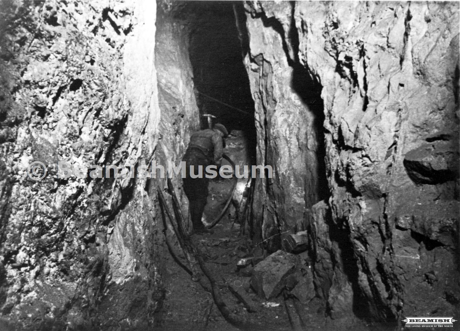 Miner in fore end working, Settlingstones Witherite Mine. Date: c1930, from the Beamish Museum Photoarchive