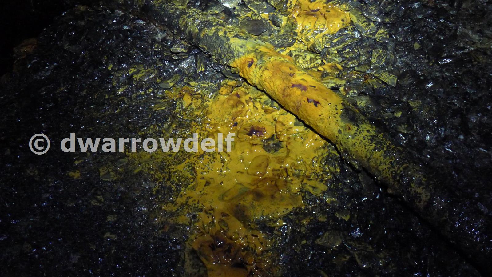 We came upon interesting yellow and orange deposits in the vicinity of one of the roofing shafts down into the Oakeley workings on floor E back vein.