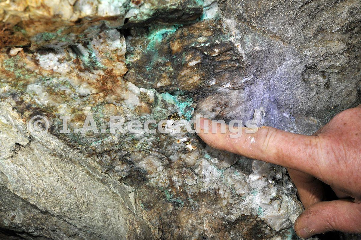 Minerals (malachite, chalcopyrite) on the wall of the branch into Man Engine Chamber on the main adit level. [October 2012]