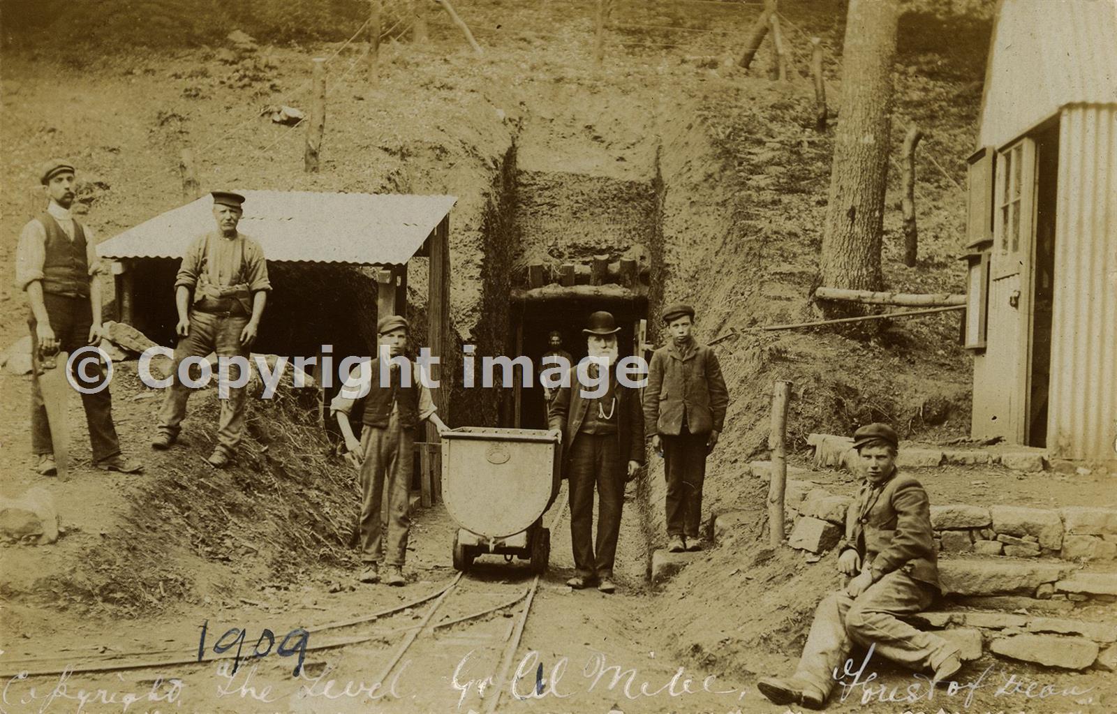 A bearded man presumed to be the owner or manager accompanied by mine workers pose outside the entrance to Bailey Level with one of the tipper wagons.