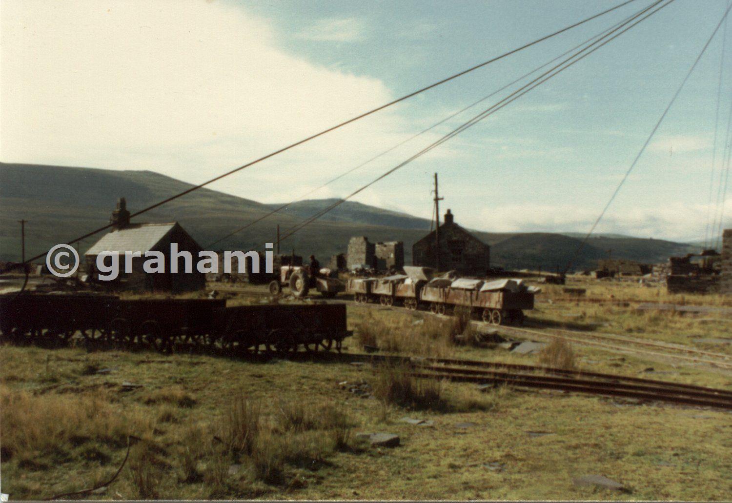A farm tractor draws a run of slate wagons from the blondin landings towards the mill.