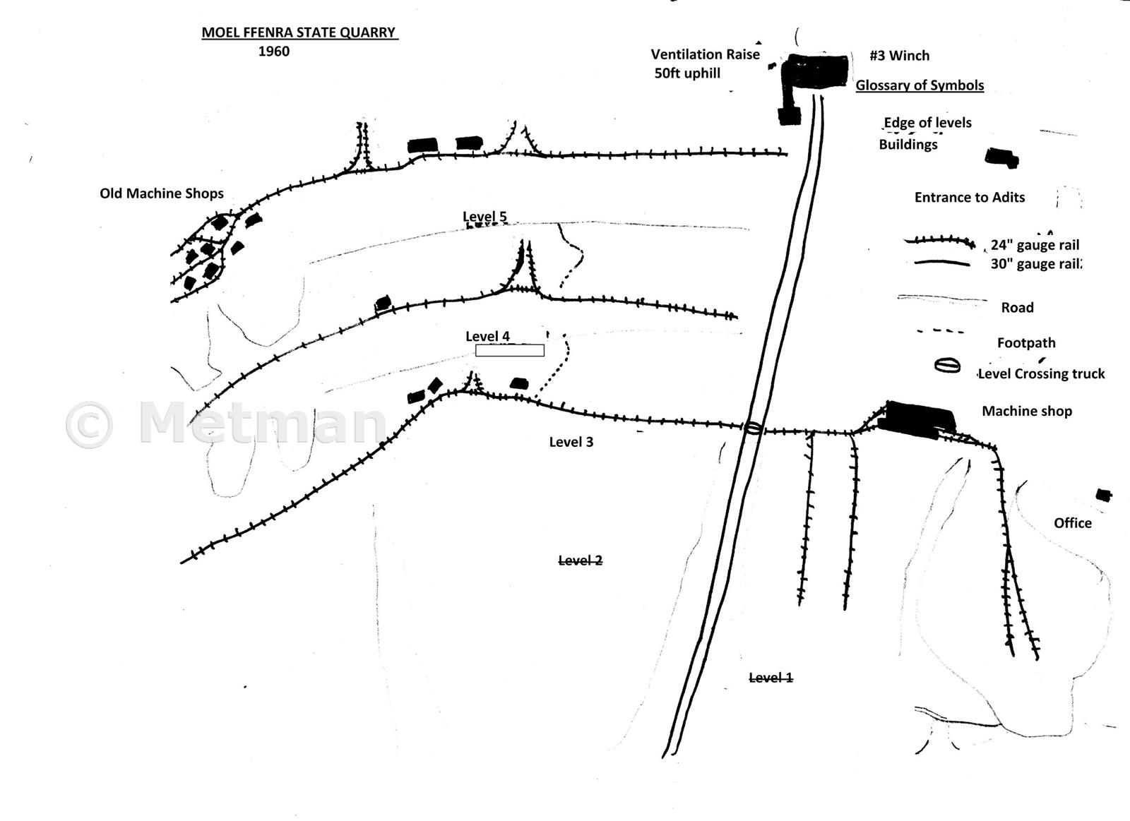 Former levels 1 & 2 were buried below new levels. Access to levels 6 & 7 were from level 5( the only level with two adits