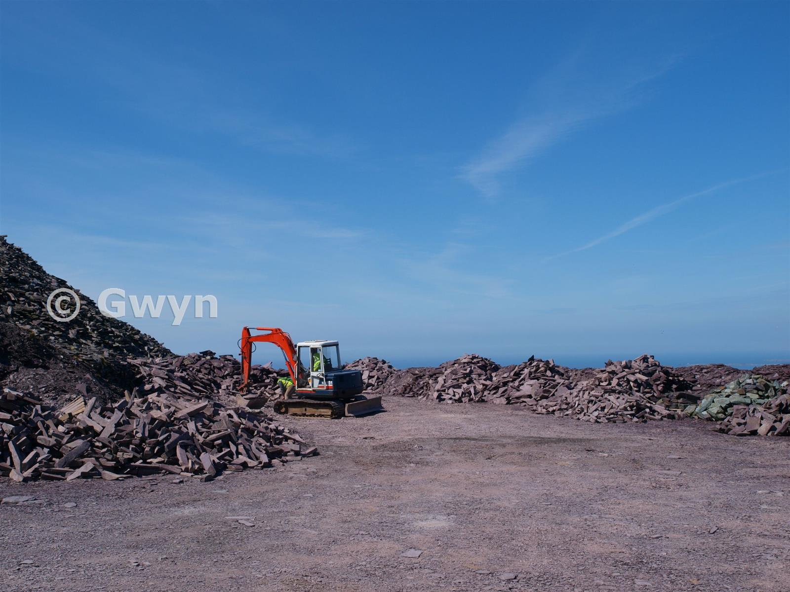 Tidying up the site after the filming of "A Snowdonia Farmhouse". Moel Tryfan is permitted to rework the tips area for decorative stone, hence the sorted piles of slate. April. 2010.