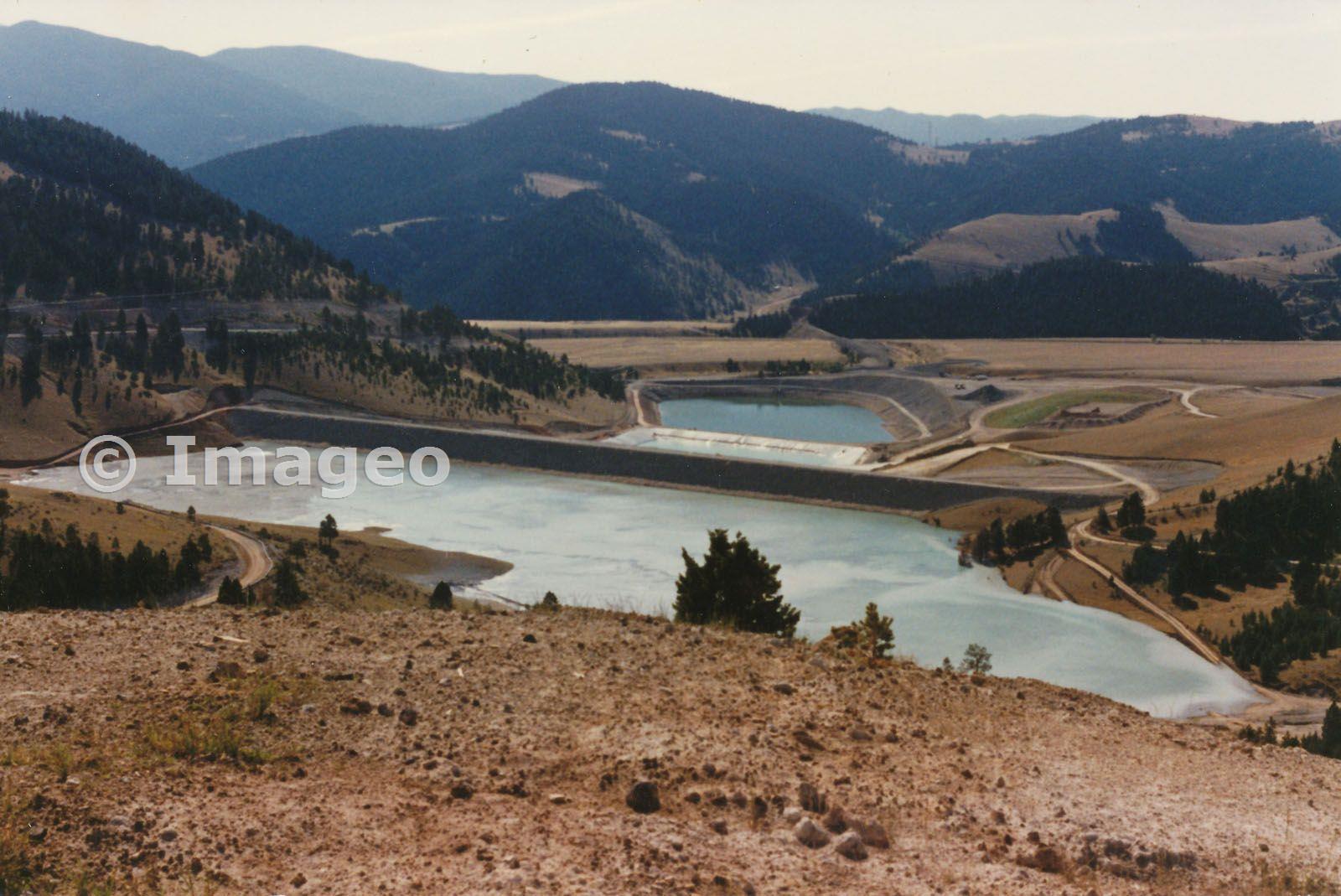 Looking southeast across the tailings dam and seepage pond towards Wickes in the valley.
