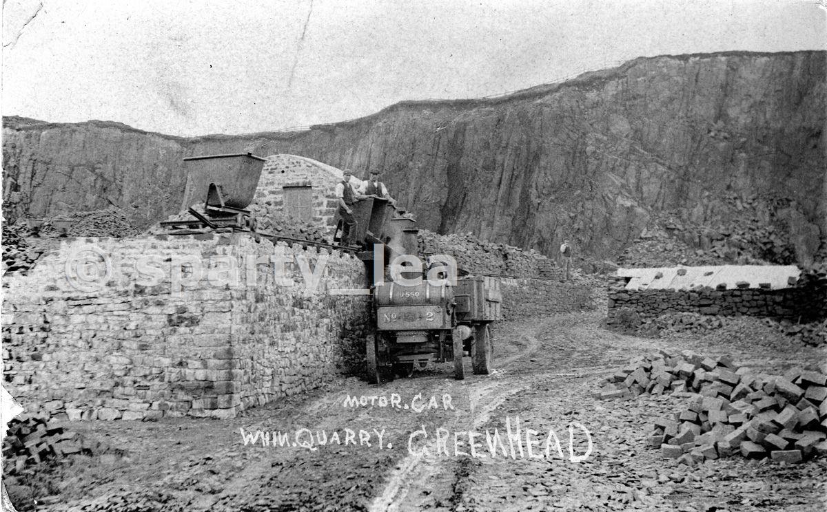Loading whinstone into a 'motor car' The quarry also produced whinstone setts which are the small regular blocks which can be seen lying in the picture, these were knocked into shape by hand and used for paving.