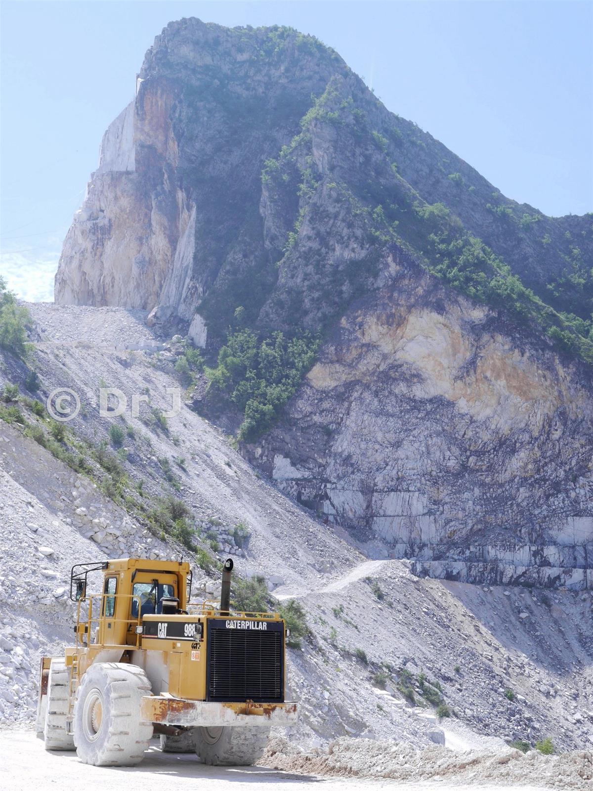 Loader in one of the higher Fantiscritti quarries, looking across to the ridge-line (or what''s left of it!) with Colonnata valley)