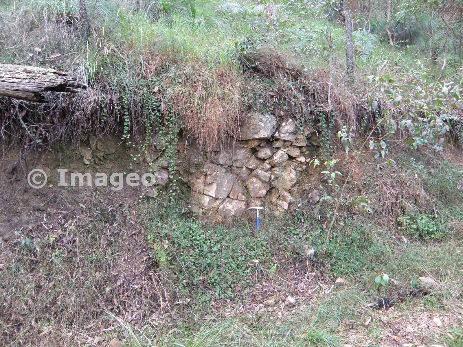 Exposure in the perimeter track cutting east of the mine. This appears to be an extension of the Pereverance Reef. Bucky quartz with trace chalcopyrite.