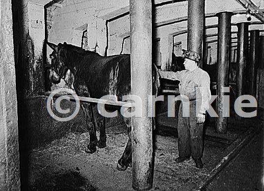 Shenandoah, Pennsylvania. Interior of a mule stable in the Maple Hill mine, seven hundred feet below ground, showing a miner and some mules. Once they go down the mules don't come up until they die. Some have been down for the last twenty-five years. Courtesy Library of Congress, Prints & Photographs Division, FSA/OWI Collection, [reproduction numberLC-USF34-040414-D