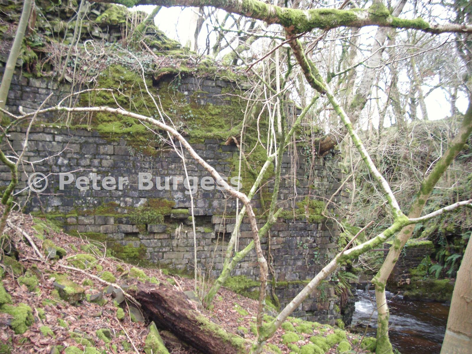 The stone built bridge abutment on the north side of the river where the tramroad crosses the Nant Llech at Henrhyd.