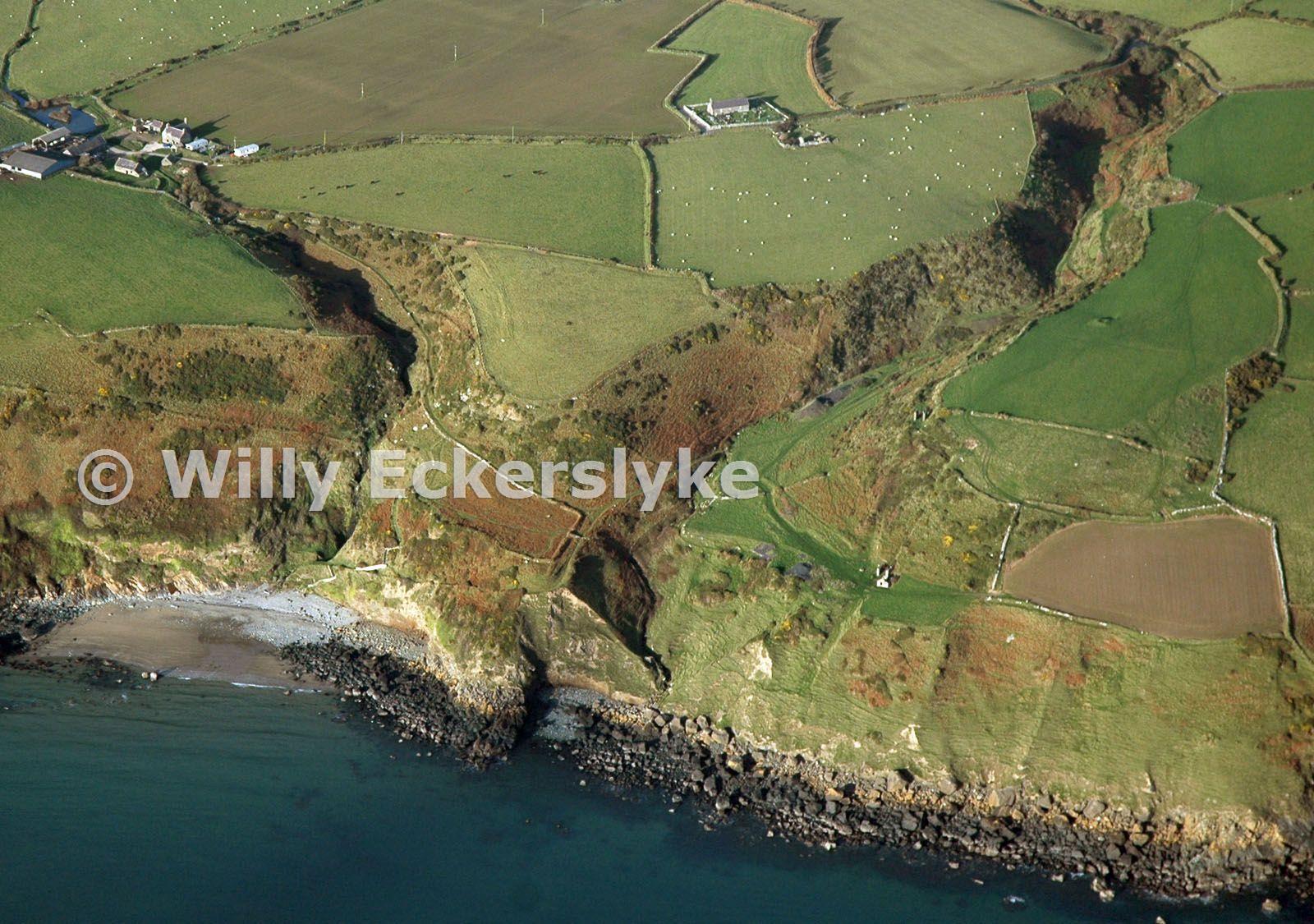 Porth Ysgo beach on left (half tide). The two inclines can be made out to the left of Nant y Gadwen valley. Llanfaelrhys church at top centre.