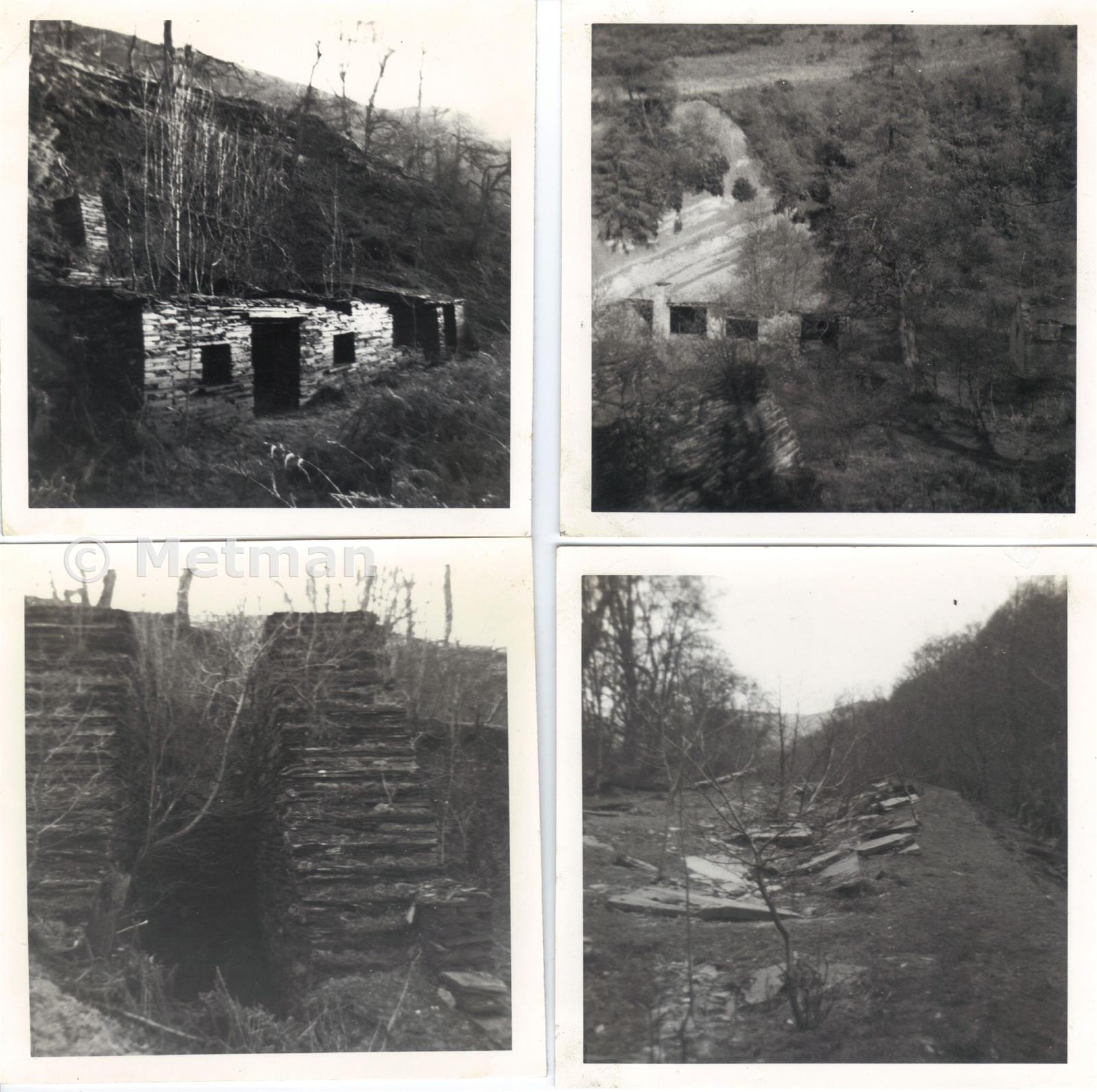 In the early days of the Deeside Slab Quarry all splitting of slate was done in this natural glade about a mile above the village at 750 ft elevation. There are reports that the tramway connecting the Deeside slab quarry and Nany-y-Pandy works was built "before" 1876, and merely repaired in that year. The tramway crosses the Nant-y-Pandy at this point. Buildings included the blacksmiths shop, and finishing shed (upper pictures), there was also a joiners shop, office and machine shed (This was probably demolished when the wheel was removed in 1923- parts of it were used at Cwm farm). There was never any electricity at this site- all power was from a 30ft overhead water wheel fed by an upstream reservoir. (The only picture I''ve seen of this wheel is in "The Moel Fferna Quarries" compiled by the Glyndyfrdwy Women''s Institute). This axle drove all the machinery in the adjoining workshop, all lighting at the works was by oil lamps. Broken waste slate was dumped downstream of the works beside the Pandy stream. There is an alternative access at this point used by past workers, to follow a path on the east of the stream from where it crosses the A5 (Limited parking), it goes up to a couple of cottages, but beyond that is overgrown as it skirts the waste dumps. Above this point there were long sections of ladder style iron covered plate rail on longitudinal wooden sleepers. Also sections of "bridge rail" on the waste dumps.