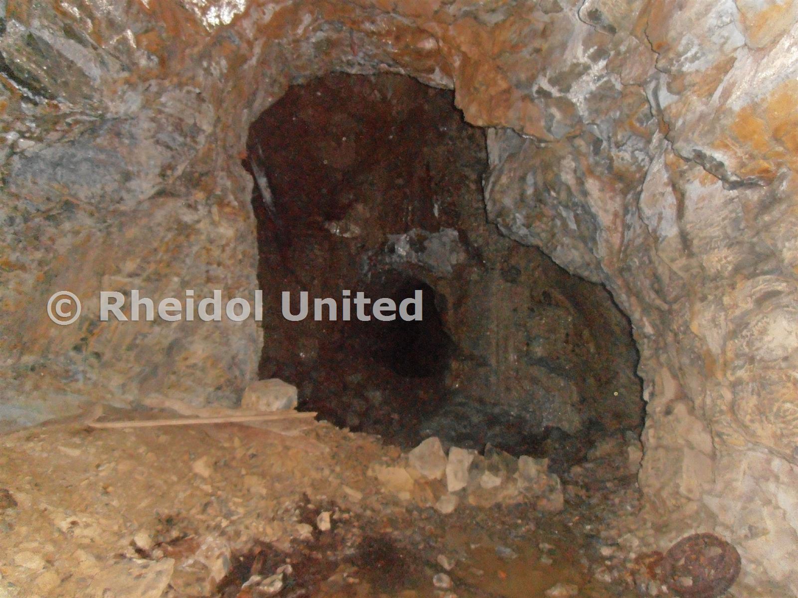 The impressive stopes from the whim chamber. Note the single flanged wheel in bottom right. The level continues beyond.