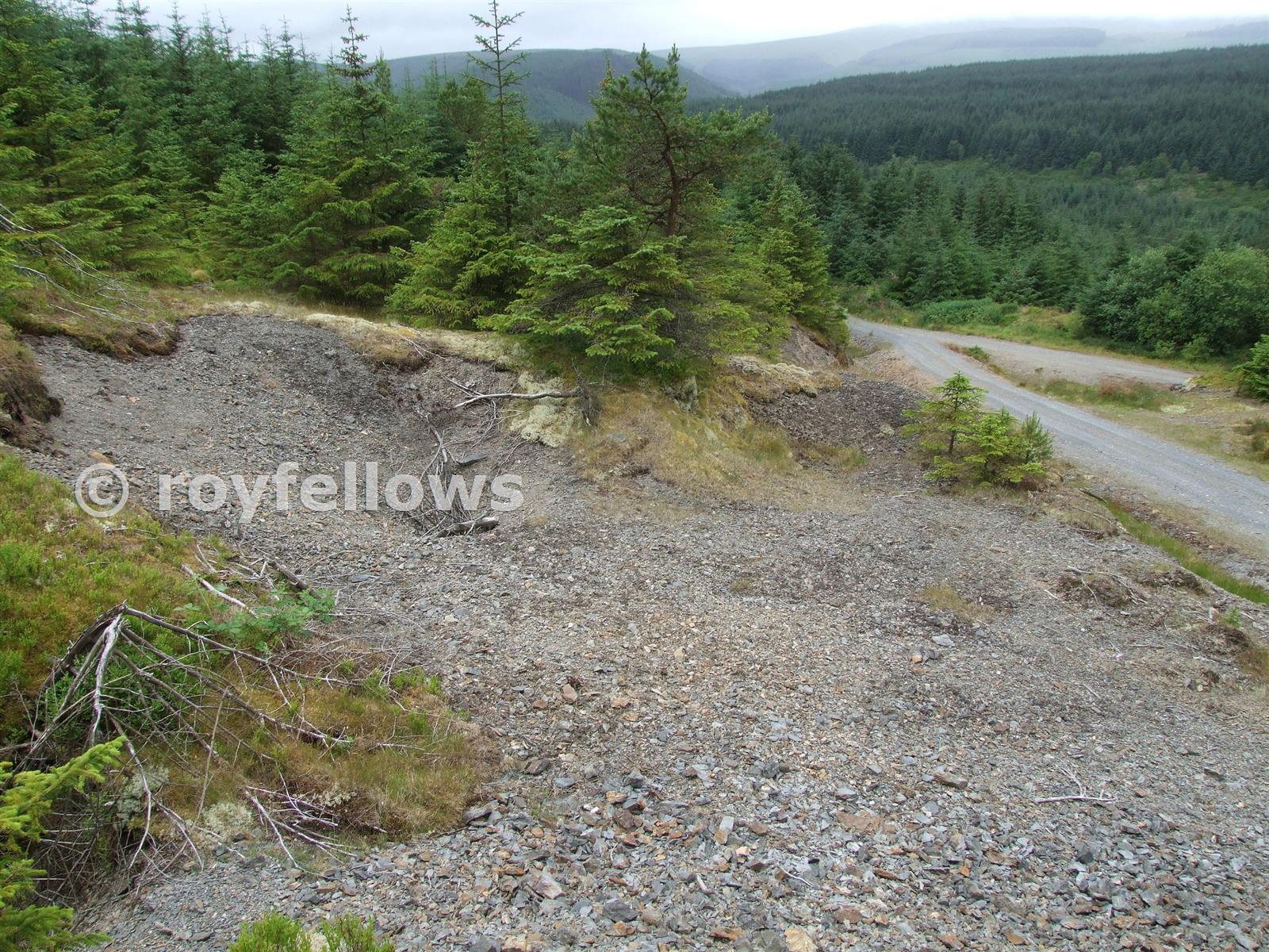 The spoil is subsiding in several places into underground workings, the completely run in adit is at the end of a cutting immediately behind the fork in the tracks, a run in shaft on the left of this. If it were not for the Forestry roads the site would be completely lost. There are probably more workings behind the camera position now lost in afforestation.