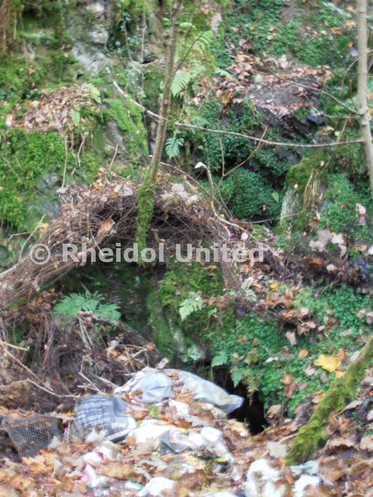 The rubbish-filled adit by the lane leading into a shaft just above.