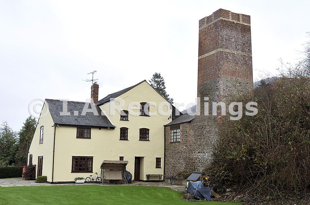 View of the boiler house and chimney (now only half its original height) and 1860 engine house (converted into a dwelling). The window to the left of the doorway, just visible above the garden seat is actually a flywheel slot. This feature can be seen on at least 2 other engine houses in this part of Shropshire. The shaft was in the overgrown area on the right.