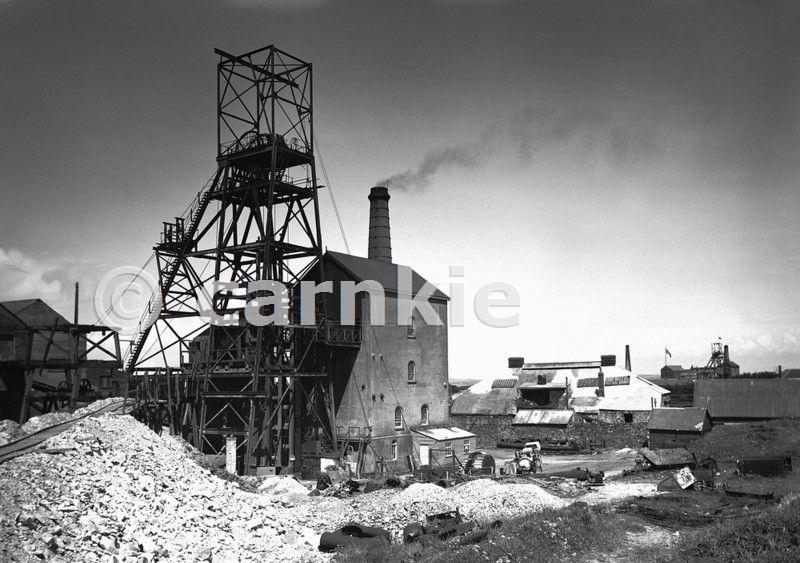 South Crofty Mine headgear. Ore is hoisted by self-dumping skip to the ore bin, left of the headgear, waste rock is fed into trucks and conveyed to the dump (left in foreground). The pump, made in 1873, has an unequal beam (10 feet stroke in the cylinder and 9 feet in the shaft) and plungers are 20 feet diameter down to 1,150 feet below the surface. The shaft is 340 fms. deep. The headgear of Robinson's Shaft (335 fms. deep) is seen on the right. Photo P208023. Reproduced with the permission of the British Geological Survey ©NERC. All rights Reserved.