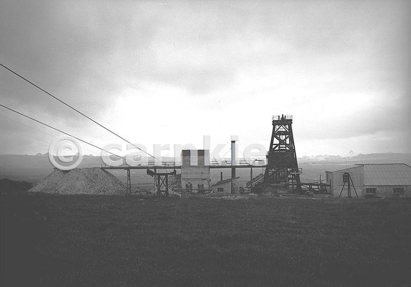 Looking south at the Castle an Dinas Wolfram Mine. The New Shaft is on the southern slopes of Castle an Dinas hill. The horizontal beam from the building on the right operates the pump; the hoisting engine house is behind the headgear. Trucks from the shaft are run along the gantry, waste rock being dumped on the left and ore into the ore bin in the centre, from which it is fed into tubs on the overhead ropeway to the mill at Old Shaft. A nearly vertical quartz-wolfram lode trending north 18 degrees east intersects an isolated hill rising 300 feet or so above the surrounding country to over 700 feet. The hill is capped by an ancient earthwork that gives its name to the mine. Photo P208061. Reproduced with the permission of the British Geological Survey ©NERC. All rights Reserved.